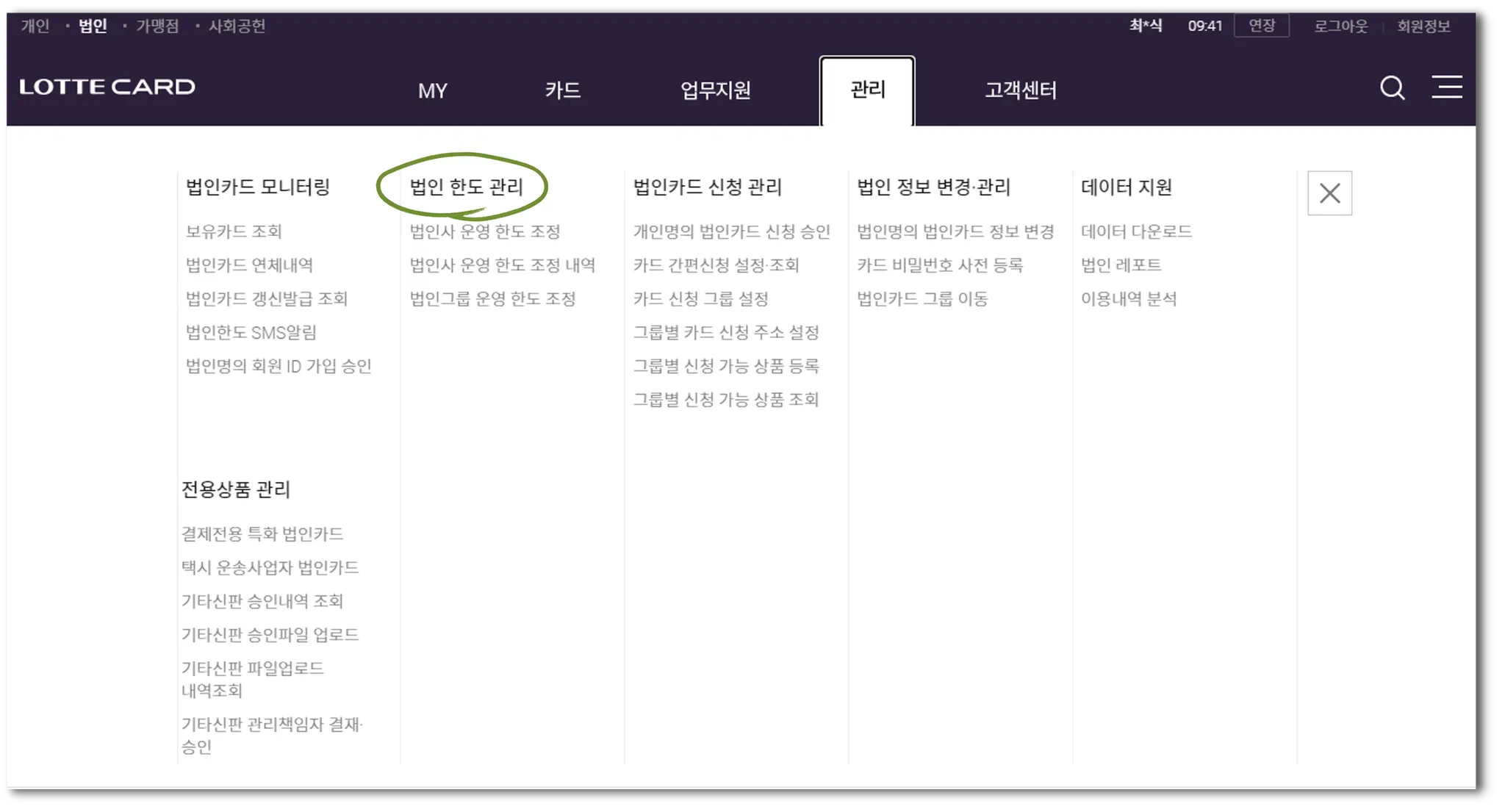 상단 [관리] > [법인한도 관리] > [법인사 운영한도 조정] 클릭