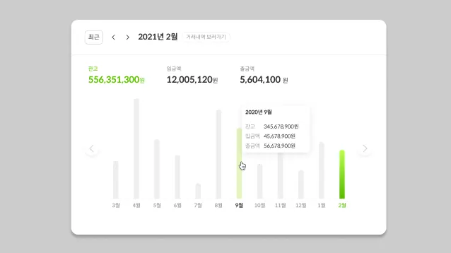 과거 12개월의 잔고와 입출금 추이를 한눈에 볼 수 있어요.