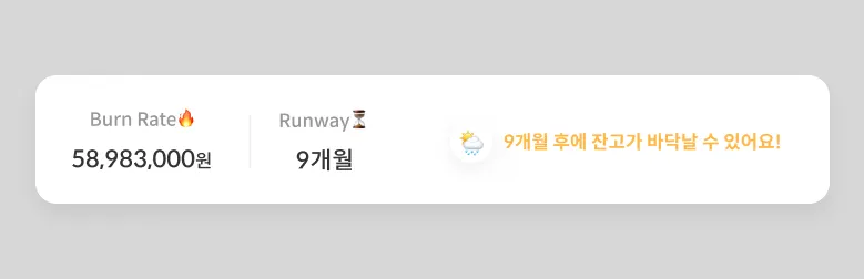 런웨이는 스타트업의 현금 소진 속도(번레이트)가 유지될 경우, 현재 잔고로 몇 개월 더 운영 가능한지 예측하는 지표에요.