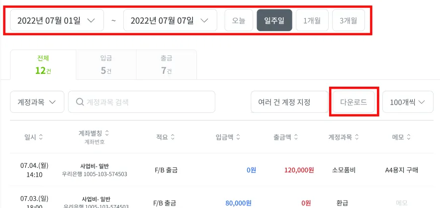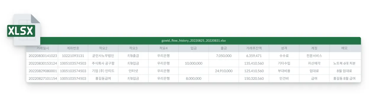 [다운로드] 버튼 클릭을 통해 선택된 조회기간 동안의 거래내역을 엑셀파일로 다운로드할 수 있습니다. 엑셀 파일에서는 지정된 계정과목과 메모 내용을 모두 볼 수 있습니다.