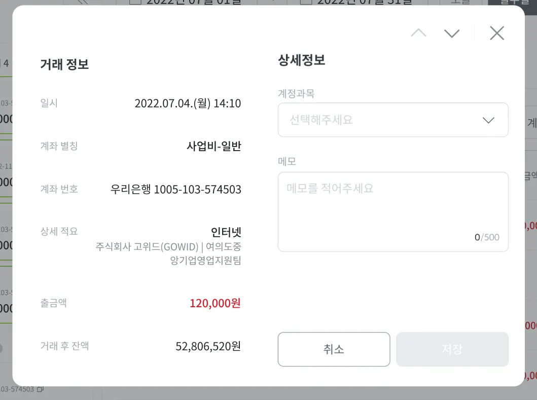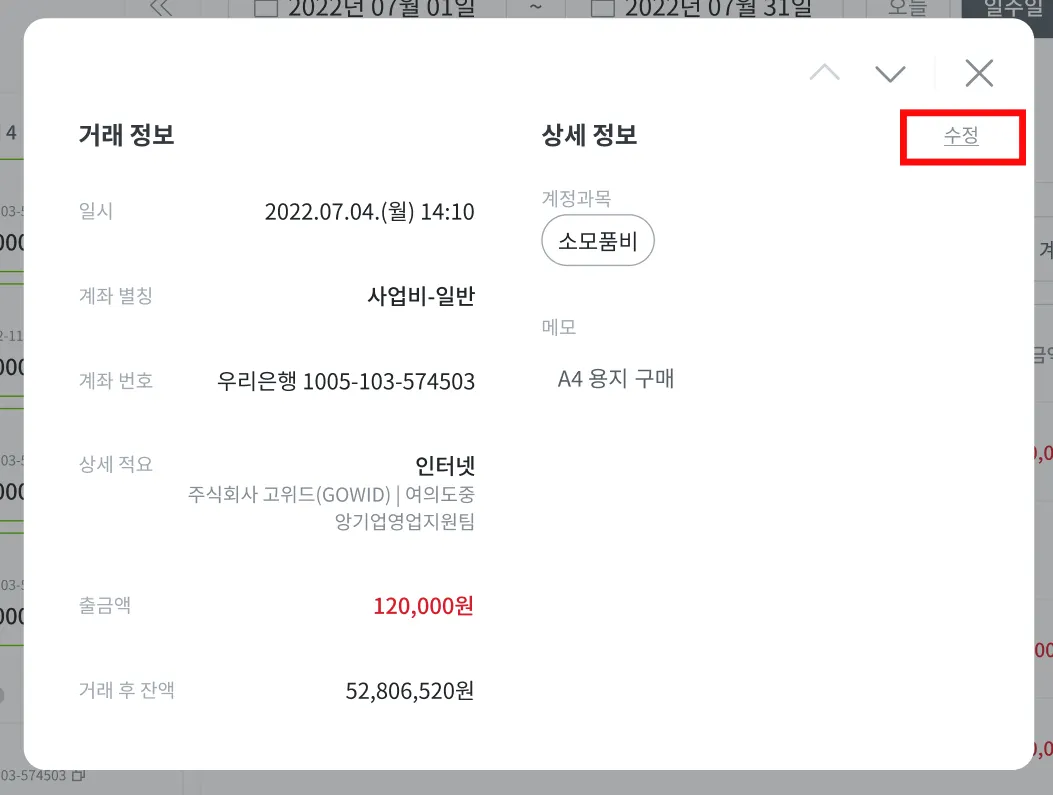 추가적인 거래 정보를 보며 계정과목 지정 및 메모를 남기고 싶으신 경우 거래내역 리스트에서 특정 거래내역을 클릭해주세요. 팝업이 나온 이후 우측 상단의 [수정] 버튼을 클릭하신 후 계정과목 지정 및 메모 입력을 하실 수 있습니다. 우측 상단의 [