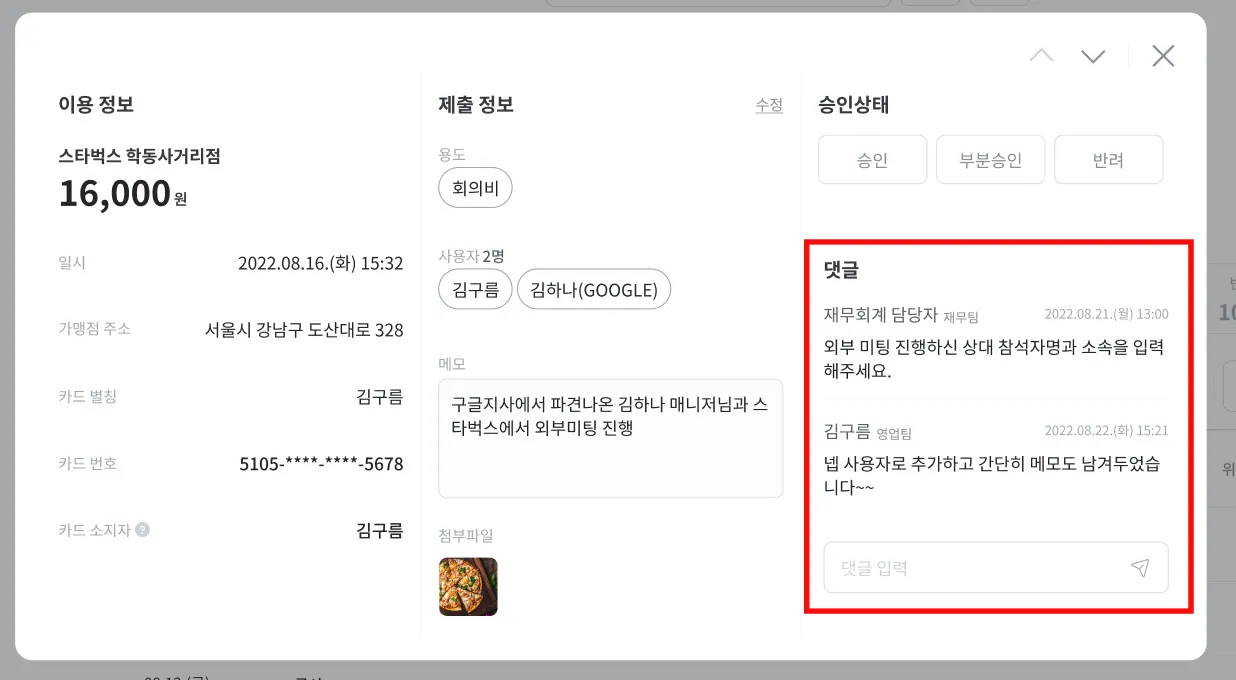 법인카드 이용내역을 검토하다보면, 사용자에게 정보를 추가적으로 요구해야하는 일이 발생합니다. 문자나 슬랙 등 다른 협업툴을 통해 따로 물어보지 않고, 해당 영수증의 ‘댓글’ 기능을 활용하면 더 빠르고 쉬운 소통이 가능합니다. 댓글을 남기면 앱 알림이 발송되며, 소통 내역이 해당 영수증에 저장되어 추후 빠른 히스토리 파악이 가능해집니다.