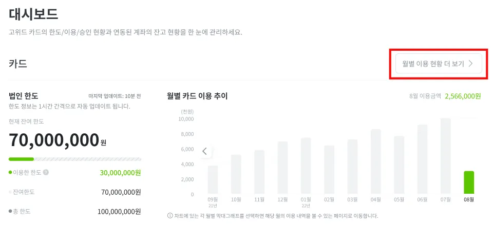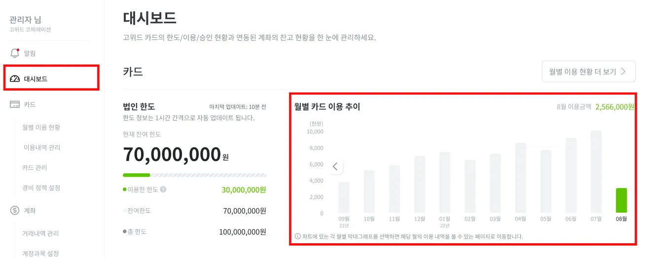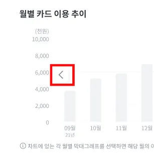 [대시보드] 메뉴에서 최근 12개월 간의 월별 카드 이용 추이를 쉽게 볼 수 있으며, 그래프 내 [
