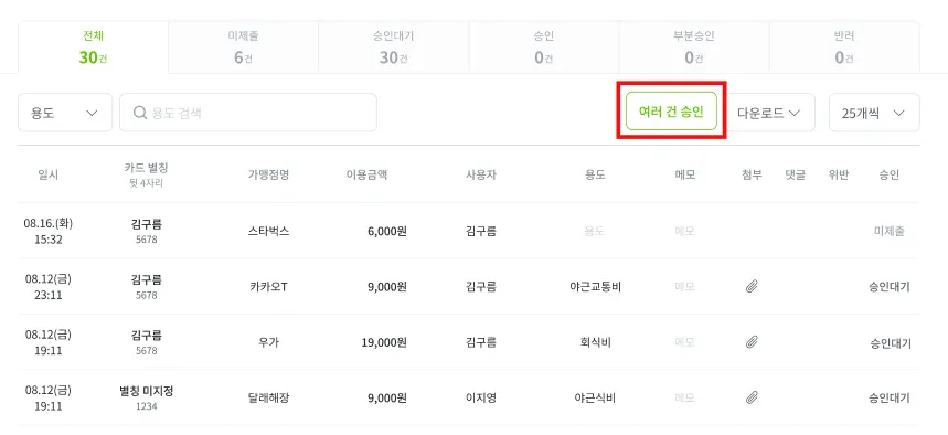 많은 결제내역을 한번에 승인해야하는 경우 [이용내역 관리] 메뉴에서 리스트 상단에 있는 [여러 건 승인] 버튼을 클릭하세요.