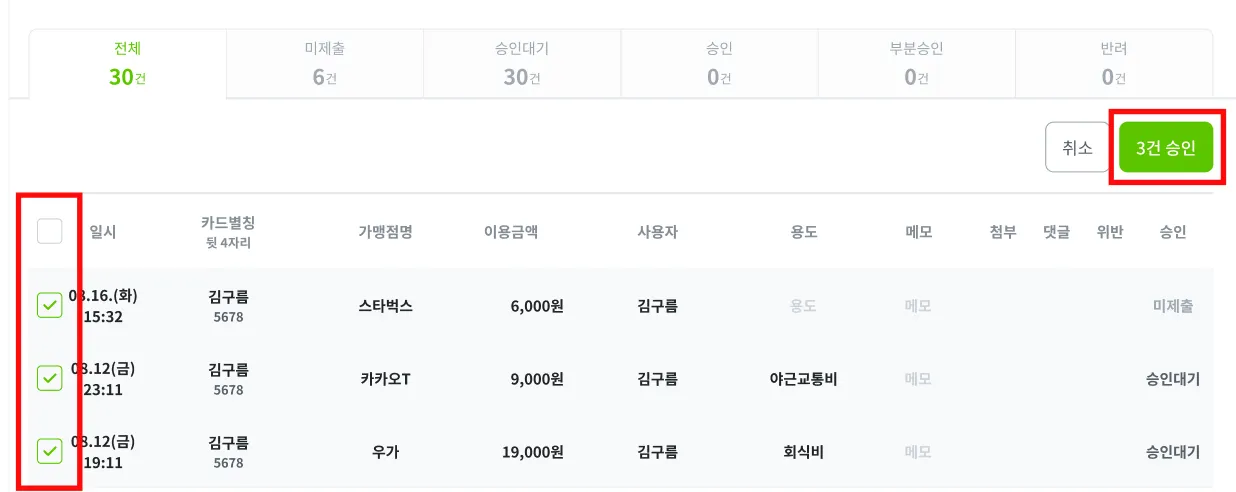 좌측에 체크박스를 통해 승인 처리가 필요한 내역을 다수 선택한 후, [n건 승인] 버튼을 클릭하면 승인 처리가 완료됩니다.