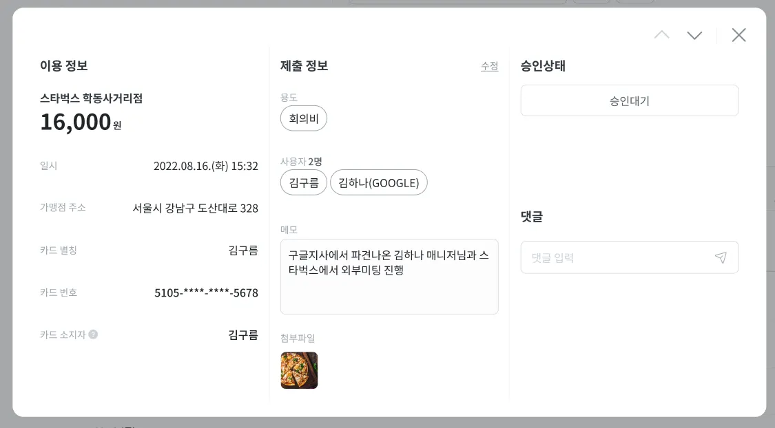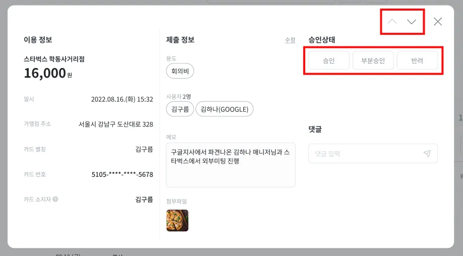 만약 승인 전 상세한 정보를 파악해야 하는 경우, 리스트에서 특정 내역을 클릭하면 가맹점명, 가맹점 주소, 사용자, 사용자 메모 등을 볼 수 있는 영수증 팝업이 뜨게 됩니다. 우측 승인상태 영역에서 해당 영수증에 대한 승인, 부분승인 및 반려를 할 수 있습니다. 우측 상단의 [