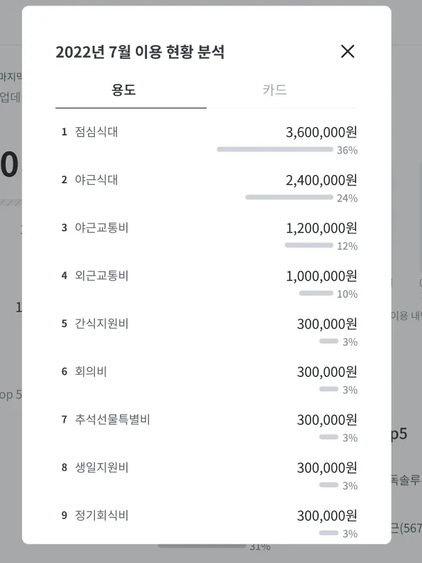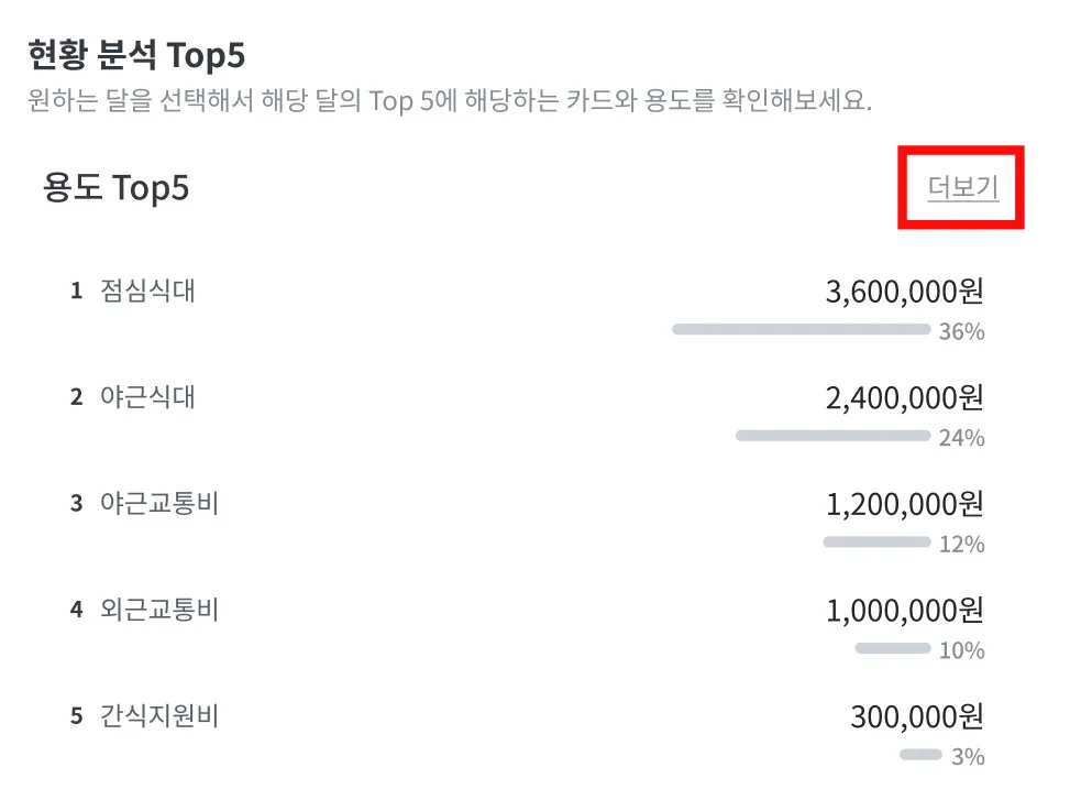 [대시보드] 메뉴의 [현황 분석 Top5] 영역에서 이번달 어떤 용도에 가장 많은 금액이 결제되었는지 쉽게 파악 할 수 있고 [더보기] 버튼을 클릭하여 모든 용도의 결제 금액을 파악할 수 있습니다.