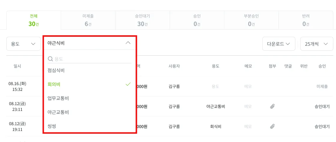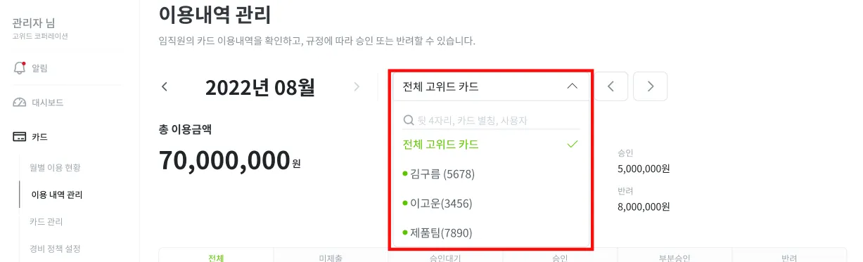 [이용내역 관리] 메뉴 내 리스트에서 승인대기 중인 이용내역에 마우스를 올리면 해당 내역을 [승인] 및 [반려] 버튼이 나타납니다. 해당 리스트에서 ‘위반’ 영역에 별도 표시가 없는 경우 정해진 정책 및 한도 내에서 알맞게 사용된 것으로 볼 수 있습니다.