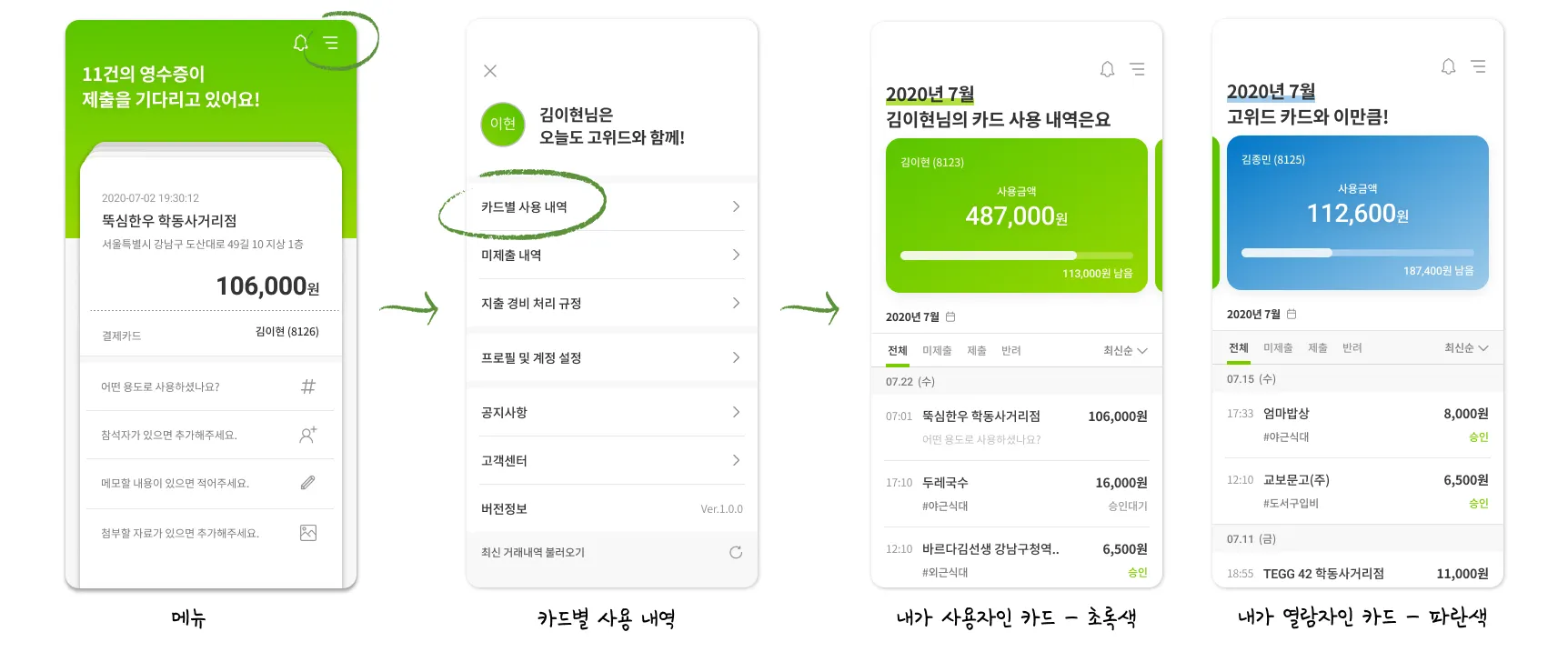 [고위드] 앱에 접속하신 후 로그인(최초 1회)하시면 ‘제출대기’ 중인 나의 카드 영수증을 바로 확인하실 수 있습니다. 만약 이미 제출한 영수증을 보고 싶다면 우측 상단의 메뉴 아이콘을 클릭한 후 [카드별 제출 내역] 탭을 클릭해주세요. 카드를 양옆으로 스와이프(끌어 넘기기)하여 다른 카드 이용 내역도 보실 수 있습니다. 연도-월 날짜 옆 [캘린더] 아이콘을 클릭하여 조회 월을 쉽게 선택하실 수 있어요.