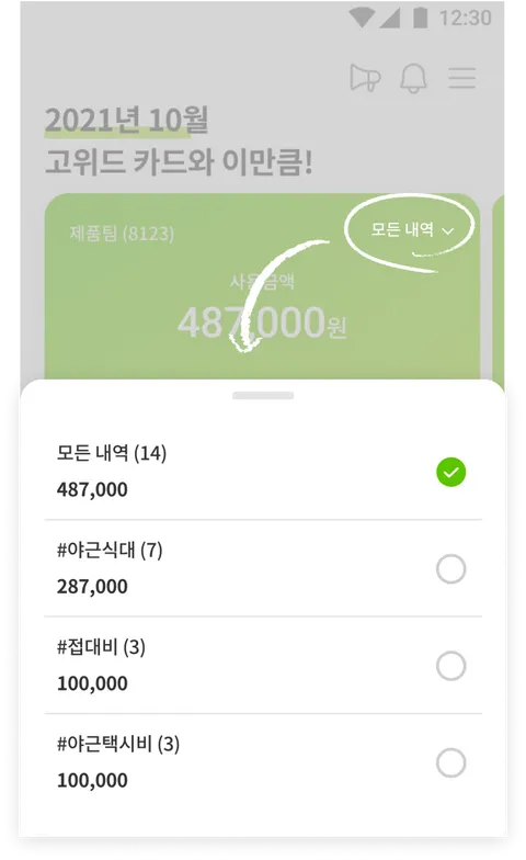 고위드에서는 내가 소지하고 있는 카드 뿐만 아니라, 열람 가능한 여러 개의 카드 이용내역을 조회할 수 있습니다. 열람 권한에 대한 설정은 법인 관리자가 진행합니다.