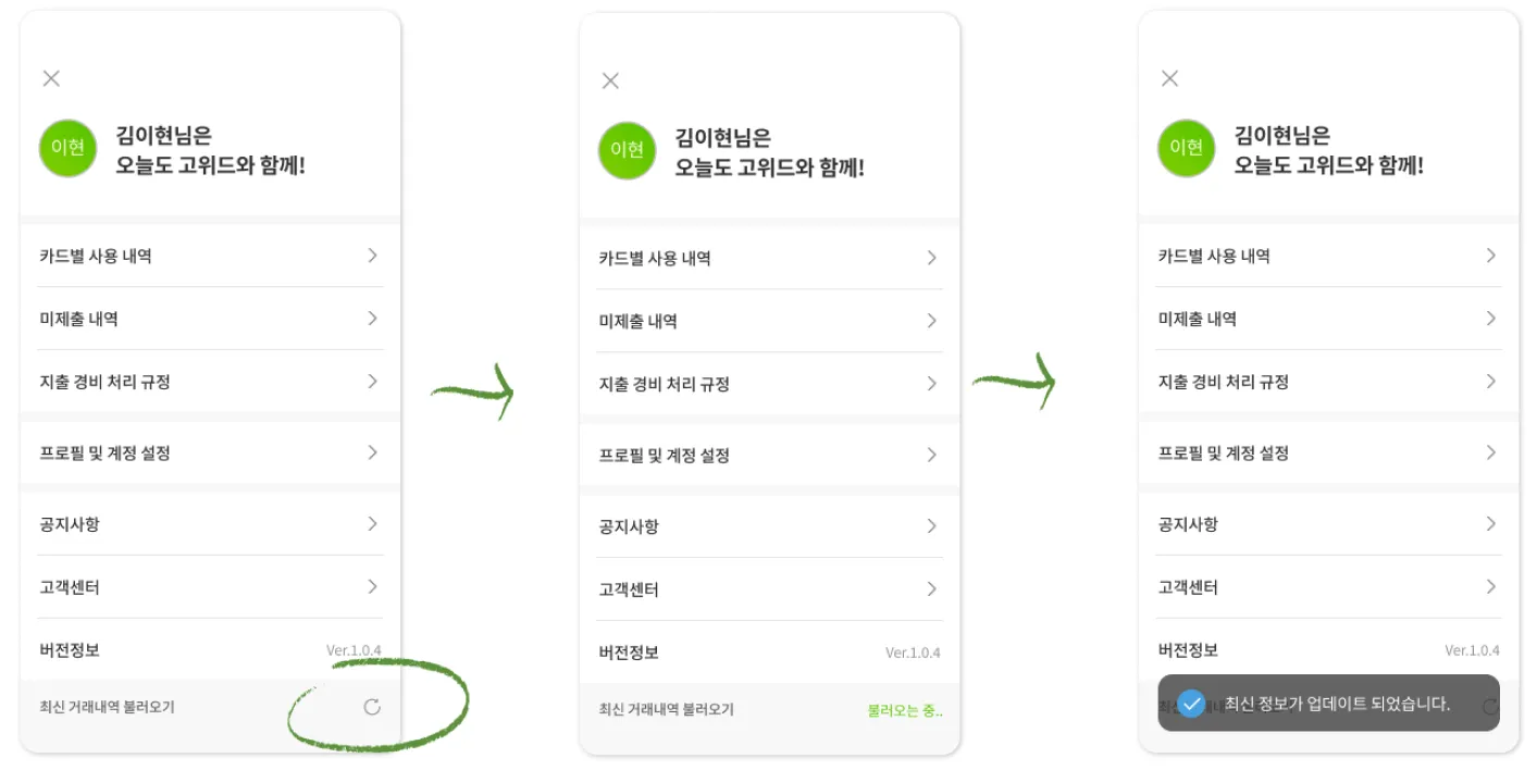 결제된 후 5분 내 영수증이 자동으로 등록되지만, 만약 실시간 업데이트가 필요한 경우에는 최신 내역을 수동으로 불러올 수 있습니다. 우측 상단의 메뉴 아이콘을 누르신 후 하단의 [