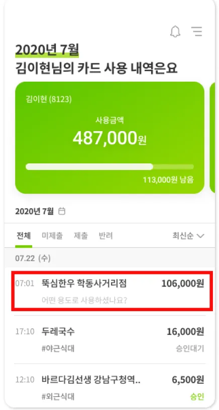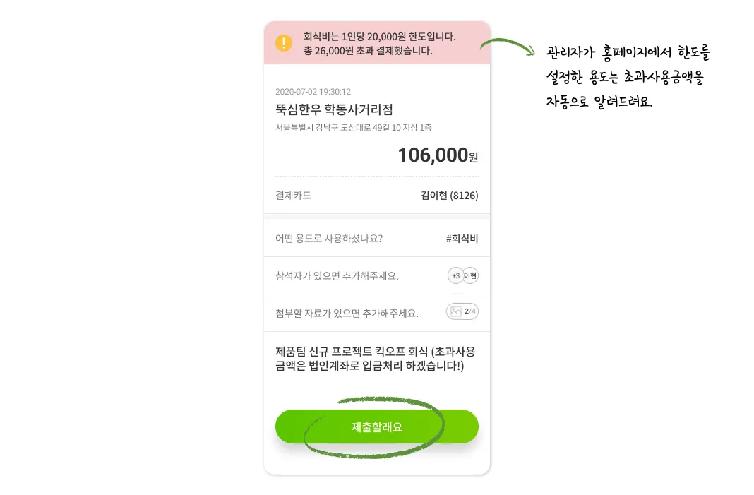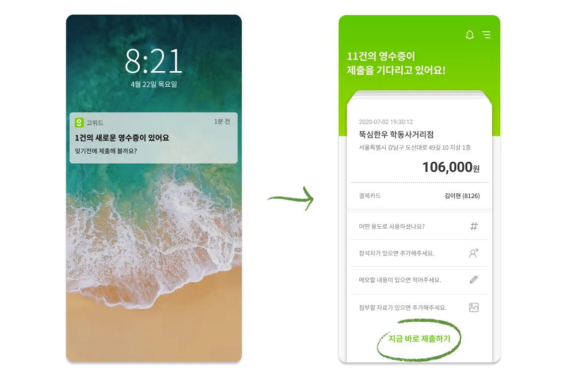 고위드 카드로 결제하시면 5분 이내에 영수증 제출 알림이 발송됩니다.