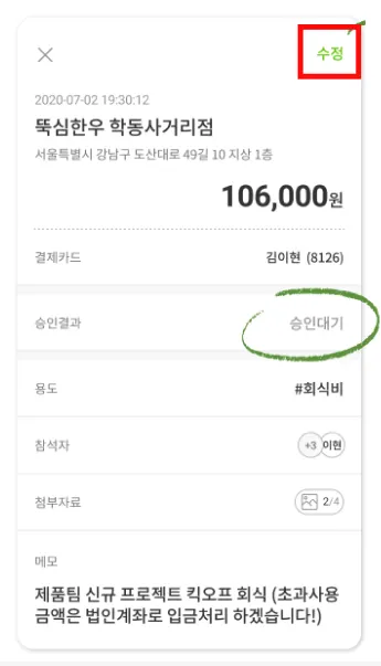 아직 영수증이 승인되지 않은 상태라면, 특정 영수증 선택 후 [수정] 버튼을 클릭하여 용도 및 참석자 등을 수정하실 수 있습니다.