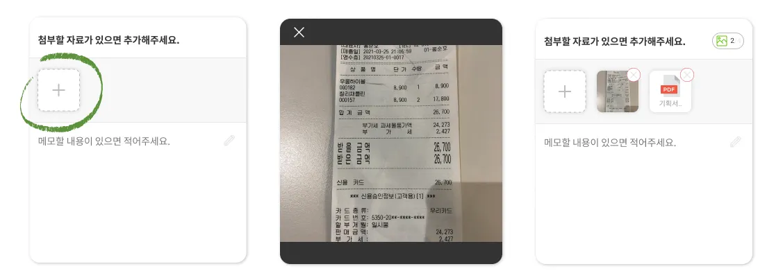 Step 3. 필요하다면 영수증을 촬영하거나 별도 파일을 첨부할 수 있어요.